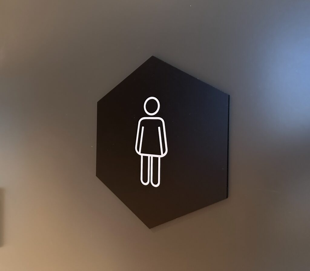 WC uksetähis on välja freesitud mustast PVC materjalist. Piktogramm om peale trükitud UV-printeriga. Silt on liimitud uksele.